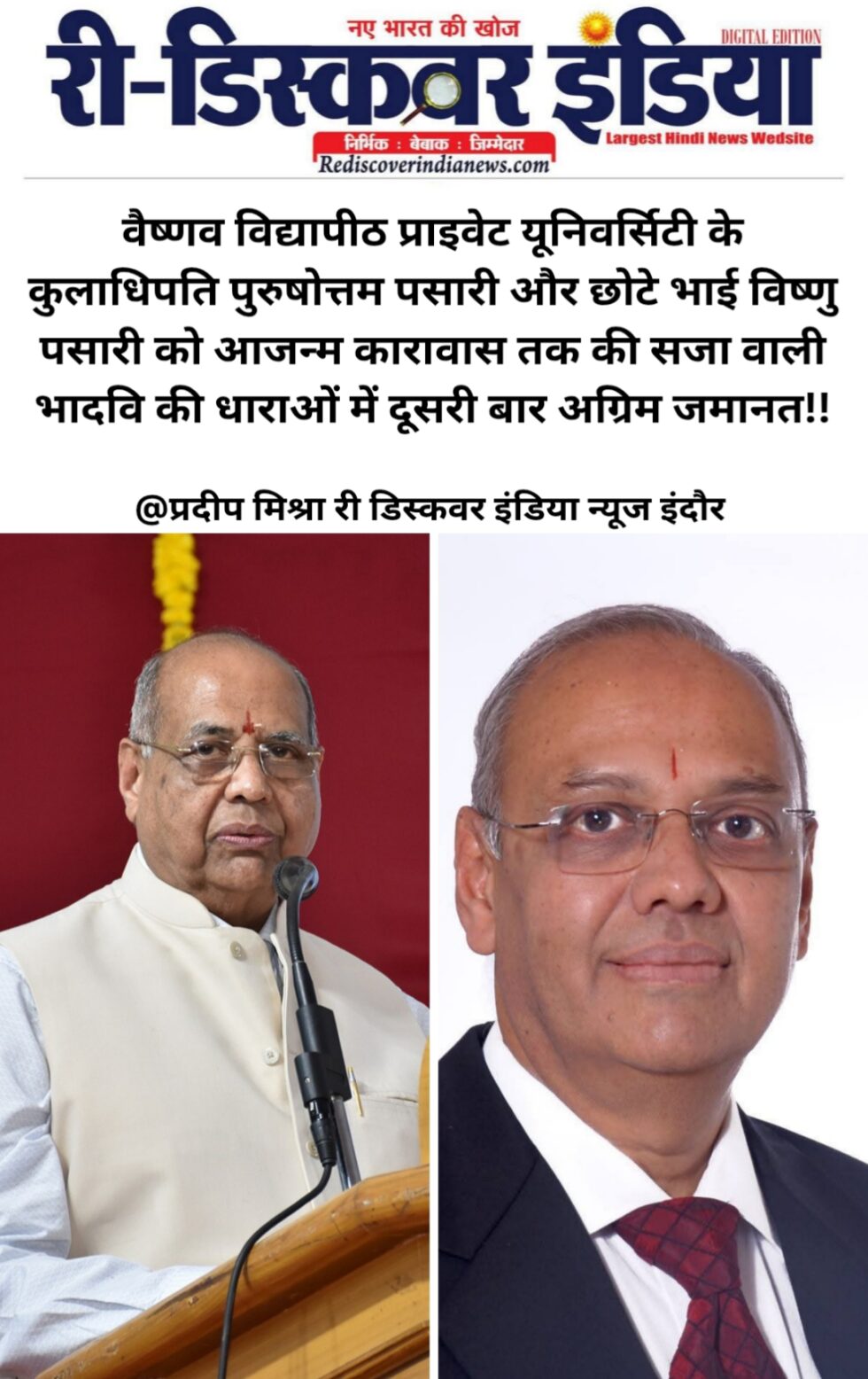 वैष्णव विद्यापीठ प्राइवेट यूनिवर्सिटी के कुलाधिपति पुरुषोत्तम पसारी और छोटे भाई विष्णु पसारी को आजन्म कारावास तक की सजा वाली भादवि की धाराओं में दूसरी बार अग्रिम जमानत!!