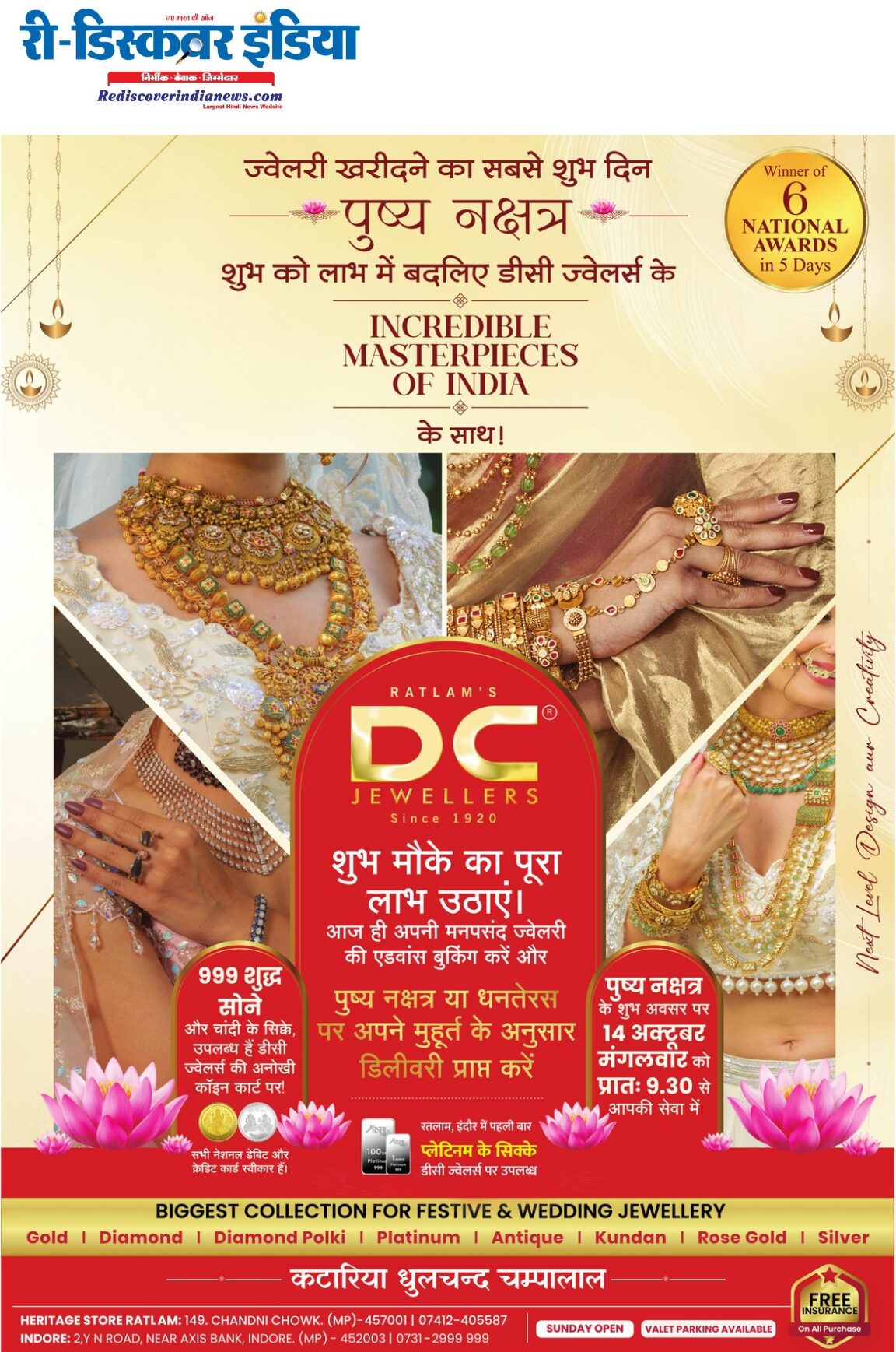 999 शुद्ध सोने और चांदी के सिक्कों और इंदौर में पहली बार प्लैटिनम के सिक्कों के साथ इस साल के 5 राष्ट्रीय और अंतर्राष्ट्रीय अवॉर्ड – रिटेल ज्वेलर्स गिल्ड अवॉर्ड! एक्सीलेंस इन डिजाइन 2025! ज्वेलरी रिटेलर ऑफ द ईयर 2025! नेशनल ज्वेलरी अवॉर्ड 2025! इंडियाज कूलेस्ट स्टोर अवॉर्ड 2025!के विजेता DC ज्वैलर्स के साथ अपने सौभाग्य और शुभ को लाभ में बदलिए पुष्य नक्षत्र के शुभ दिन से शुरूआत कर के।