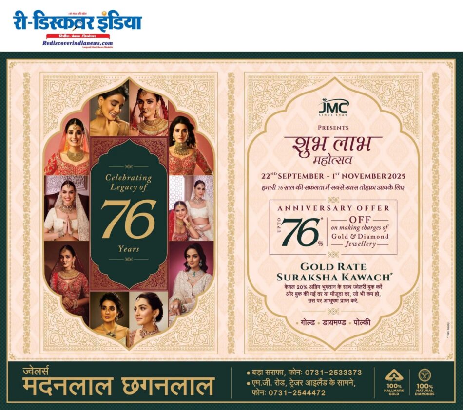 इंदौर का यह प्रतिष्ठित और हॉलमार्क ज्वेलरी शोरूम अपने शानदार 76 सालों के सुनहरे सफर की वर्षगांठ पर अपने सभी ग्राहकों को आने वाले त्योहारों के सबसे बड़े सीजन में –