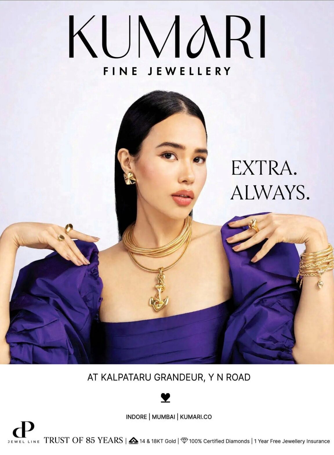 आज की सक्सेसफुल, इंटेलीजेंट, सशक्त, प्रोफेशनल और कॉर्पोरेट यंग गर्ल्स और विमेन के फ़ैशन, प्रोफेशन,पर्सनालिटी और लाइफस्टाइल को मैच करती एक प्रीसियस फाइन ज्वेलरी की ऐसी रेंज जो उनके डे टु डे लाइफ़, वॉर्डरोब और विशेष अवसरों पर उनके व्यक्तित्व को निखार कर, उनकी पर्सनालिटी में चार चांद लगा देने कि आवश्यकता को देखते हुए……..85 सालों से रतलाम से पूरे सेंट्रल इंडिया में प्रतिष्ठित DP ग्रुप की यंग जनरेशन द्वारा बहुमूल्य, कस्टमाइज फाइन ज्वेलरी की विस्तृत रेंज को “कुमारी” फाइन ज्वेलरी ब्रांड के मुम्बई मे दो स्टोर के बाद तीसरे स्टोर की शानदार सौगात इंदौर शहर को दी है।