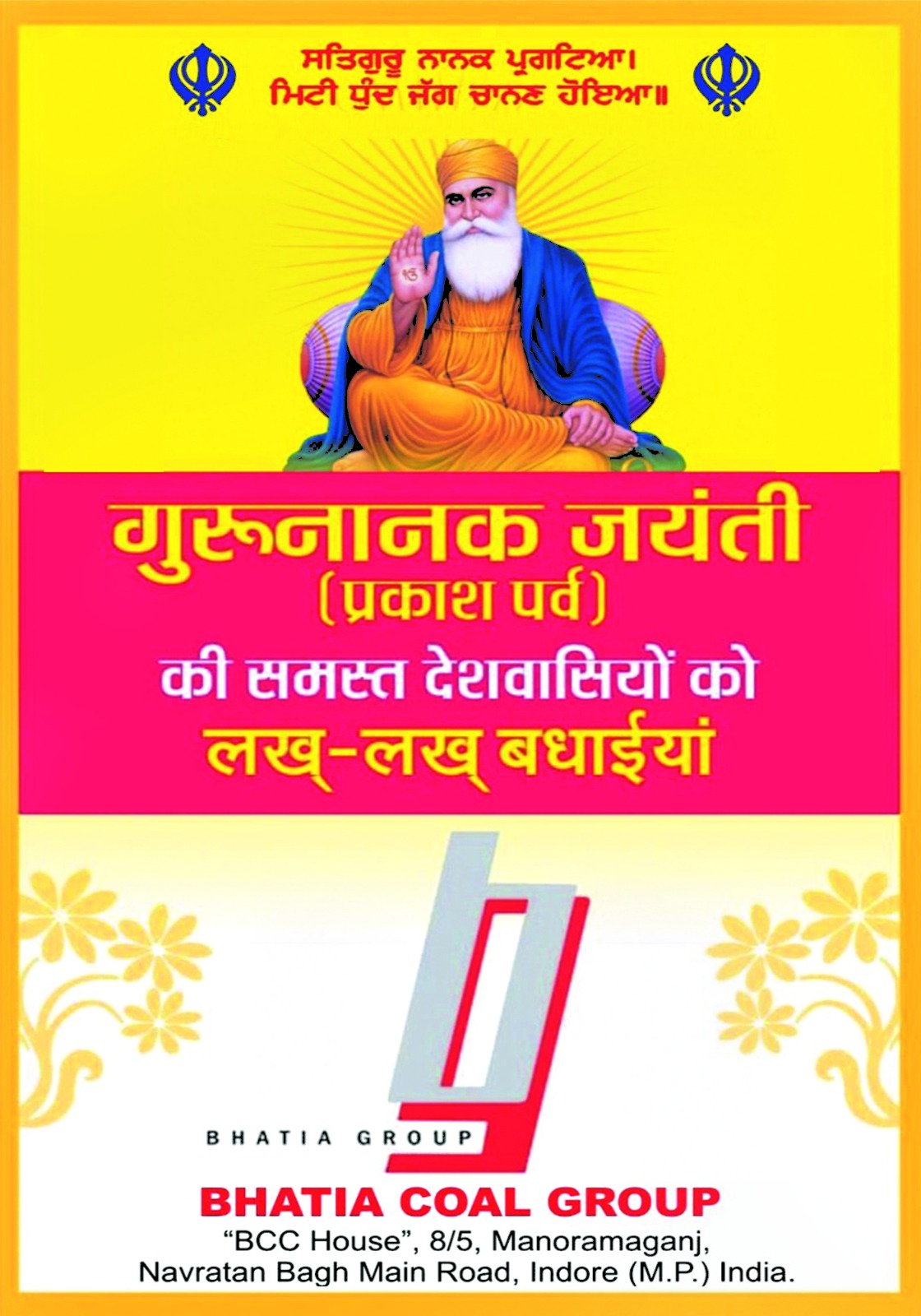 सत्य, प्रेम और सेवा का मार्ग दिखाने वाले श्री गुरुनानक देव जी के चरणों मे कोटि कोटि नमन – भाटिया कोल ग्रुप BCC हाउस इंदौर।