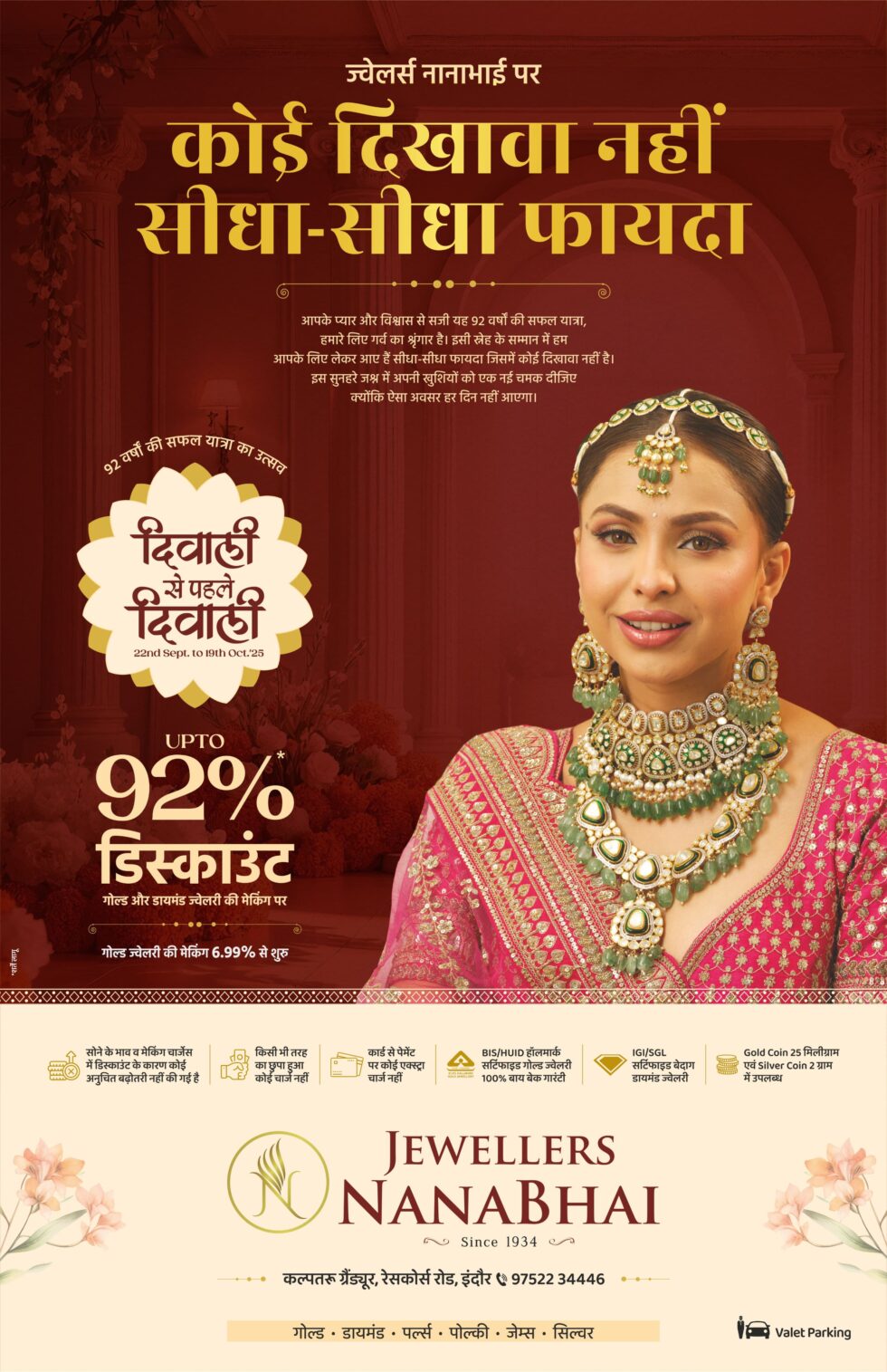 ज्वेलर्स नानाभाई के श्री केतन सोनीव श्री कौशिक(कान्हा) सोनी कहते हैं – हमने आज तक सबसे अनमोल कमाई के रूप मे ग्राहकों के विश्वास को जीता है। इसलिए नौ दशकों से हम अपने ग्राहकों को सर्वश्रेष्ठ और अद्वितीय कारीगरी से सजे उम्दा आभूषण प्रदान करने की परम्परा निभा रहे हैं। इन सालों में कई पीढ़ियां हमसे परिवार की तरह जुड़ी हैं और अपनी सफलता का उत्सव परिवार की तरह नानाभाई ज्वेलर्स के साथ हर्षोल्लास से मना रही है। इसलिए हमने 92 प्रतिशत तक की छूट का ऑफर, बिना किसी हिडन चार्जेस के दिया है। हमने सोने के बढ़ते भाव और मेकिंग चार्जेस में डिस्काउंट के कारण दाम में कोई अनुचित बढ़ोत्तरी नहीं की। ताकि दिवाली से लेकर विवाह तक की हर खरीदारी ग्राहक खुश मन से कर सकें।