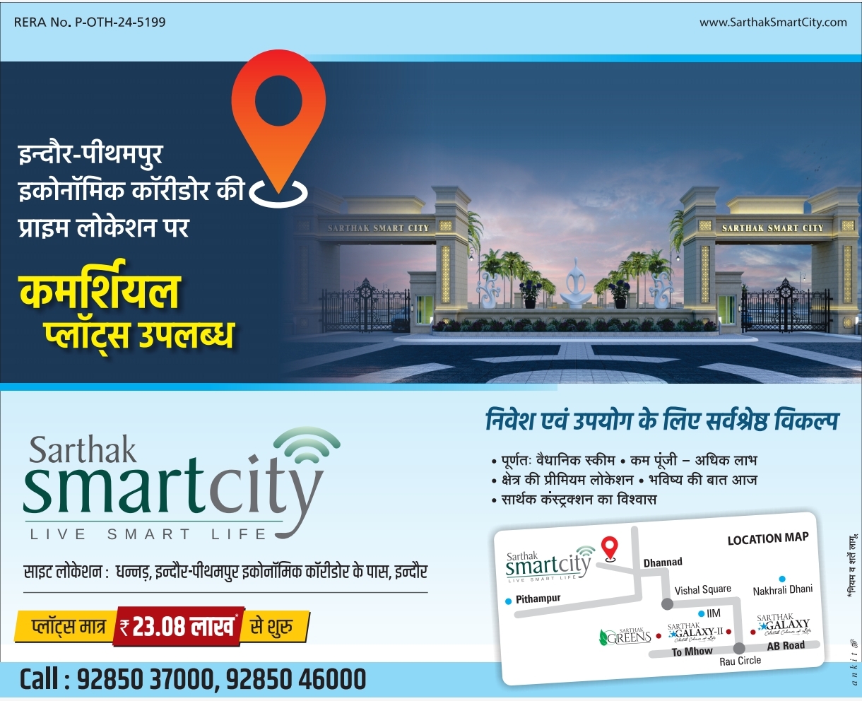 ऐसा ही रियल एस्टेट प्रोजेक्ट इंदौर पीथमपुर इकोनॉमिक कॉरिडोर पर सार्थक स्मार्ट सिटी के नाम से इंदौर के रियल एस्टेट क्षेत्र में दशकों से ग्राहकों के बीच विश्वास का पर्यायवाची बन चुके प्रतिष्ठित सार्थक कंस्ट्रक्शन ग्रुप द्वारा लॉन्च किया गया है।
